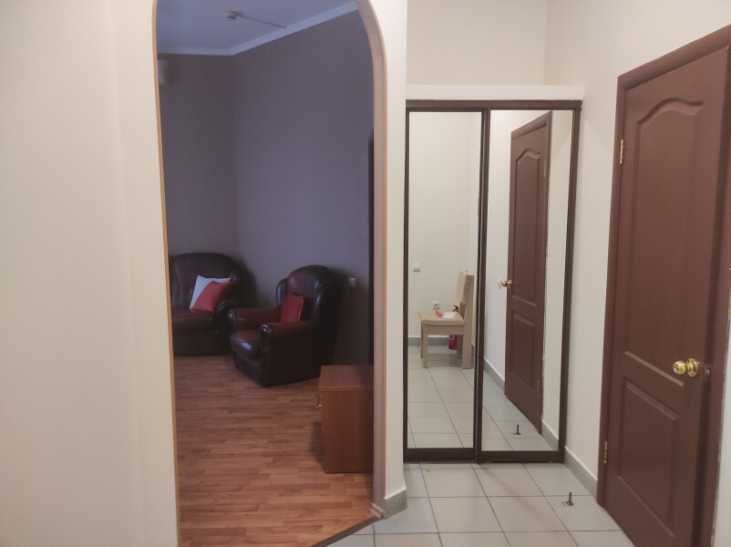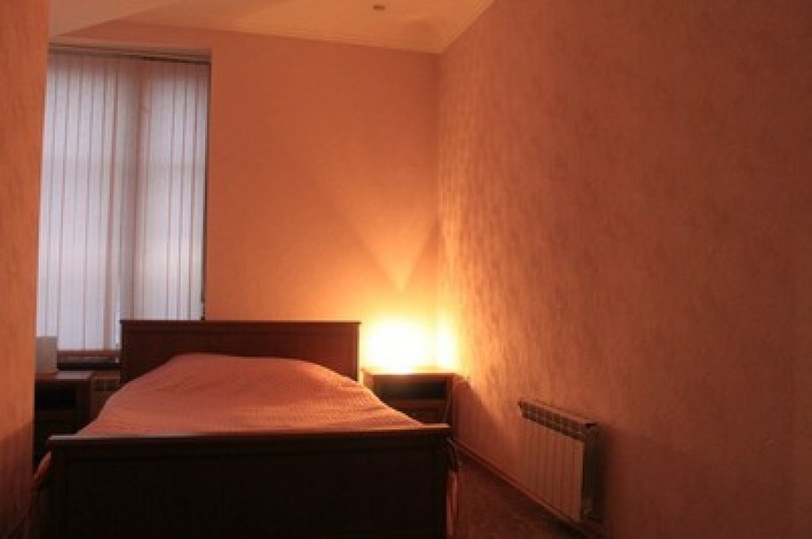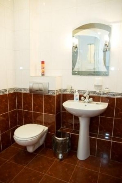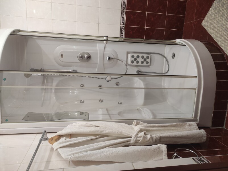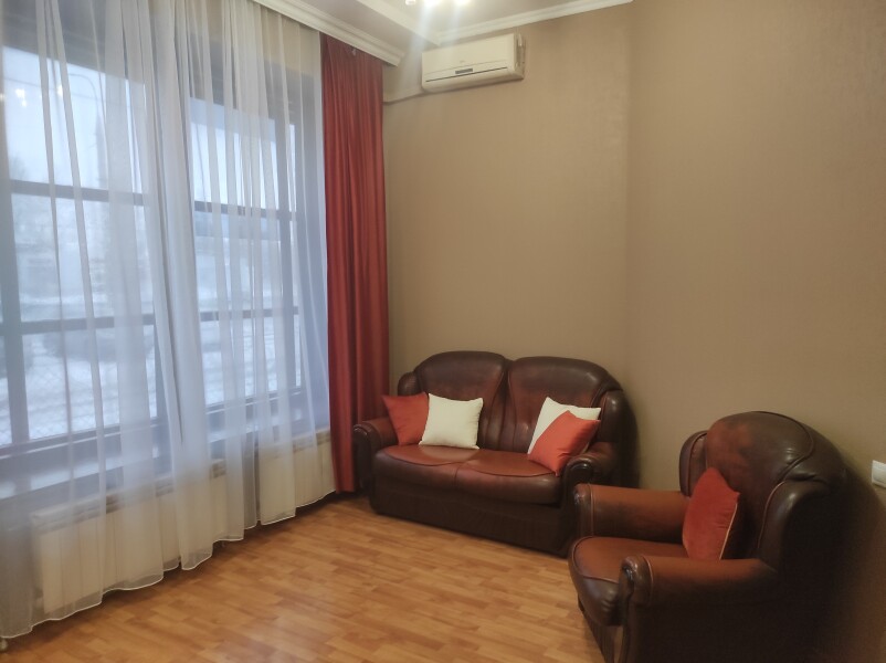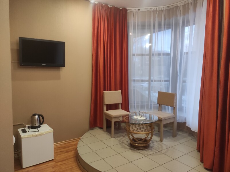 Уютный двухкомнатный номер с витражом с видом на город. В гостиный мягкая мебель, столик с креслами, телевизор, кондиционер. В спальной кровать размер 160 см, большой шкаф купе с зеркалом, прикроватные тумбы, бра. Входная зона - шкаф, тумба. В санузле душевая кабина. В комплект на одного человека входит набор полотенец, халат, тапки, мыло, шампунь. В номере фен, холодильник, чайник, чайная посуда, работает WI-FI. По требованию выдаются утюг, гладильная доска, зубные и бритвенные принадлежности.