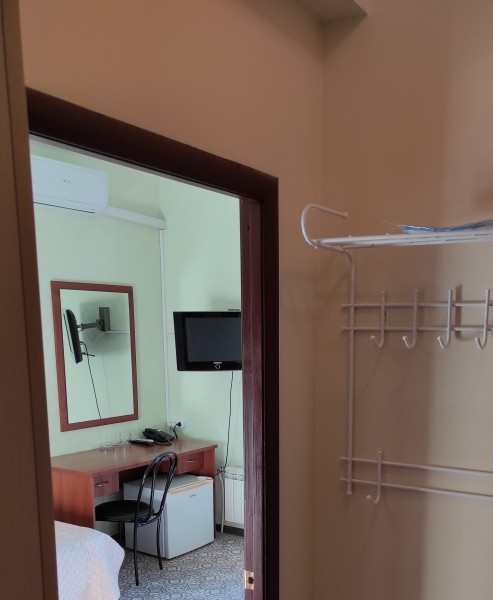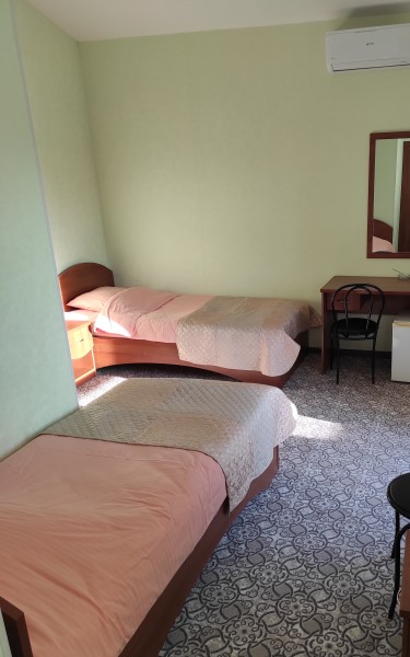 Однокомнатный номер с балконом. В номере две односпальные кровати , прикроватные тумбы,рабочий стол, шкаф купе, зеркало, телевизор, холодильник, фен, кондиционер, чайник, чайная посуда. Санузел с душевой кабиной. В комплект на одного человека входит :набор полотенец, мыло, шампунь, тапочки. Работает WI-FI. По требованию выдаются утюг и гладильная доска, зубные и бритвенные принадлежности, столовая посуда.